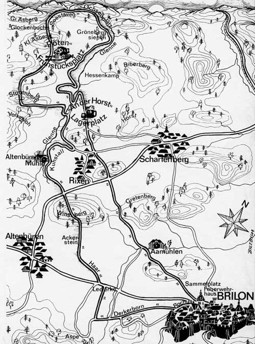 Strackestraße, Derkerborn, Lederker Weg am Steinbruch vorbei bis zur Lederke. Von dort Überqueren der Altenbürener Straße, weiter über die Haar zum Ackerstein bis Ottenkamp, sodann über den Winsberg bis zum Kuhstall an der Glenne. Weiter zum ersten und zweiten Stotenberge bis zum Volkesloh und von hier bis zu den