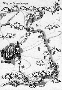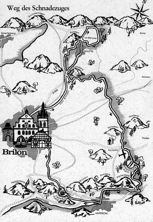 Die Schnade geht vom Marktplatz über den Steinweg zum Kreuziger Tor hinaus und nimmt dann folgenden Weg: Hasselborn, Bleikaule, über den weg zu den fünf Brücken, hinter dem Flotsberg her, über Wülfte, an den Hallersteinen vorbei und von dort die Thülener Grenze entlang zum