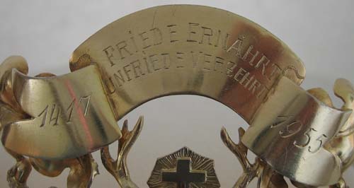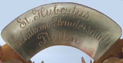 In einem Eichenlaubkranz ist in der Mitte ein Hirschkopf mit Kreuz zu sehen, das Symbol "St. Hubertus". Seitlich davon prangen die Wappen der Stadt und des ehemaligen Kreises Brilon. Ein Schriftband überzieht das Ganze. In ihm ist der Fahnenspruch der Bruderschaft eingraviert: " Friede ernährt / Unfriede verzehrt - 1417 / 1955.
