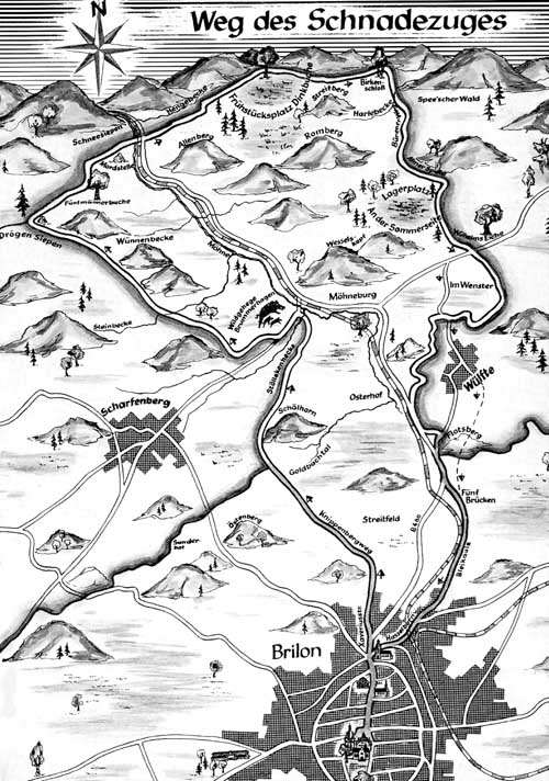 Der Rückmarsch wird gegen 19.00 Uhr angetreten, und führt über Wülfte, hinterm Flotsberg her, über den Weg zu den Fünf Brücken, Hasselborn, Steinweg zum Marktplatz